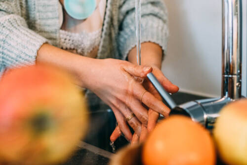 Die Hygiene beginnt schon beim Betreten der Küche. Wasche als erstes die Hände, bevor du irgendetwas anderes anfasst. Doch nicht nur bevor du anfängst, solltest du deine Hände waschen, sondern natürlich auch vor und nach der Verarbeitung von rohen Zutaten wie Rohmilch und Rohmilchprodukten, rohem Fleisch und Fisch sowie rohen Eiern.