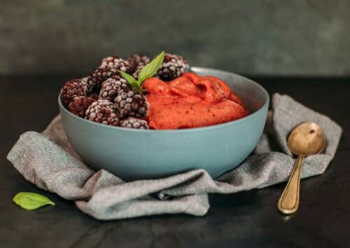 Abendessen: Avocado-Minze-Suppe mit Antioxidantien, Omega-3-Fettsäuren und Genussfaktor. Du kannst direkt 2 Portionen – 1 Portion für morgen Mittag – zubereiten. Dazu gibt es 1 Scheibe Vollkornbrot und als Dessert unsere köstliche Brombeer-Thaibasilikum-Nicecream mit einer Extraportion erfrischender Mikronährstoffe.