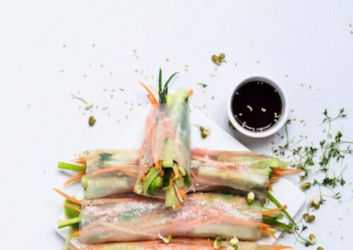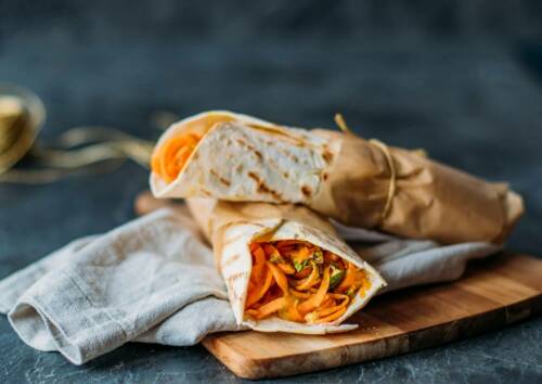 Mittagessen: Rohkostwraps die Zweite mit einer nährstoffreichen Gemüsefüllung. Damit die Ballaststoffe intensiv sättigen, kannst du dazu ein großes Glas calciumreiches Mineralwasser trinken.