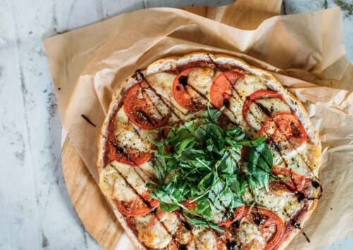 Abendessen: Schnelle Fladenbrotpizza Caprese für einen entspannten Ausklang des Wochenendes mit Genussfaktor. Dazu gibt es einen herrlich erfrischenden Grünen Eistee mit Himbeeren.