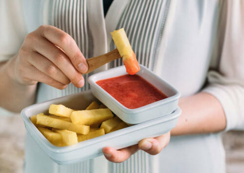 Auch die Ananas Pommes mit Erdbeerketchup kannst du in Becher füllen und so überall mit hinnehmen.