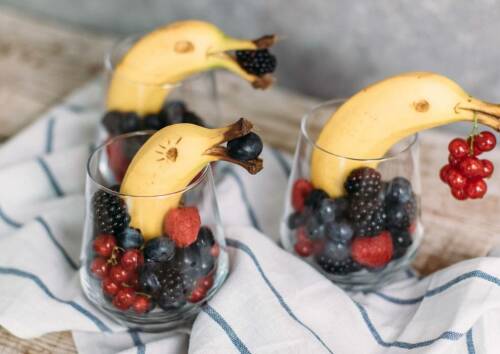 Um den Kindern Obst schmackhafter zu machen, reicht es oftmals schon, wenn du es etwas kreativer anrichtest. Diese niedlichen Delfine aus Bananen, die in einem Meer aus Beeren schwimmen, sind ein richtiger Hingucker auf dem Kindergeburtstag. Außerdem ist das Rezept so easy, dass dein Kind bei der Zubereitung helfen kann.