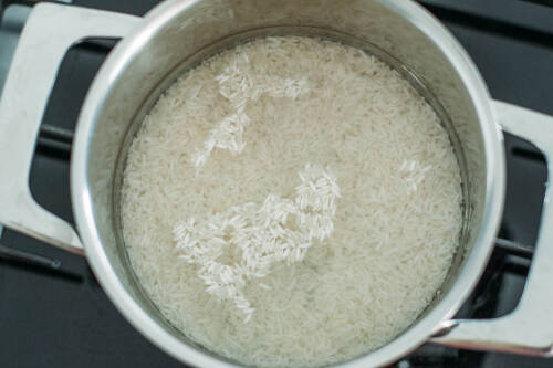 Gebe den Reis mit der 5-fachen Menge ins Wasser.