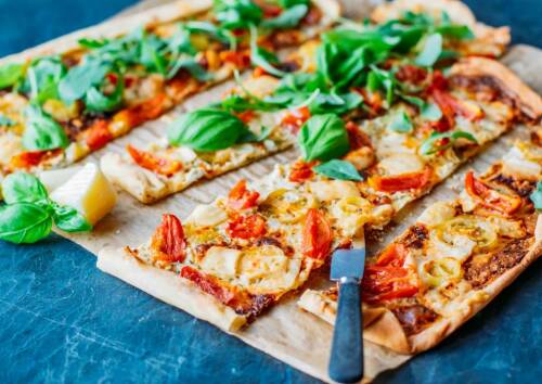 Flammkuchen mit Tomate und Rucola