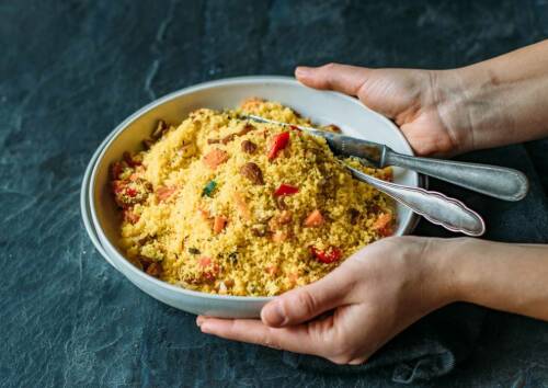 Herkömmlicherweise wird Couscous aus dem Grieß von Weizen, Gerste und Hirse hergestellt, was die kleinen Kügelchen zu einer regelrechten Gluten-Bombe macht. Doch das muss nicht sein. In dieser Variante haben wir uns für Mais-Couscous entschieden – also glutenfrei. Dieser wird mit Nüssen, saisonalen Karotten und Gurken sowie Gewürzen aus 1001 Nacht gepimpt.