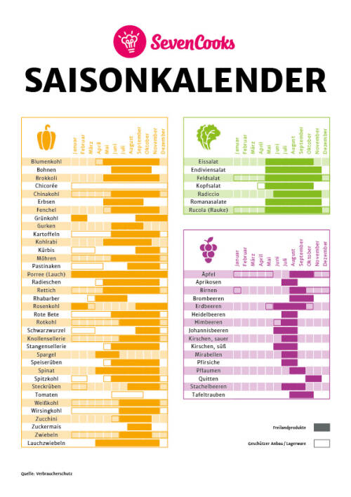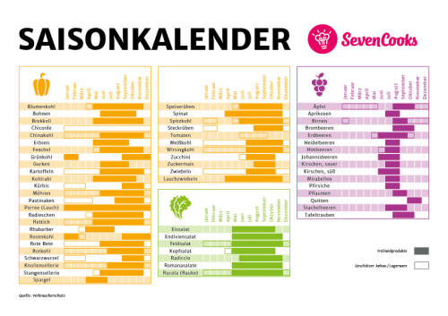 Mit dem Saisonkalender von SevenCooks siehst du auf einem Blick, wann welche Obst- und Gemüsesorte Saison hat und aus welchem Anbau sie stammt.