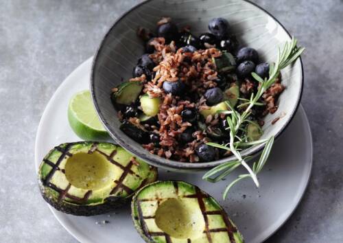 Die aromatischen Avocadohälften kannst du außerhalb der Saison einfach in einer Grillpfanne braten. Dazu servieren wir einen fruchtigen Naturreis, der mit Rosmarin, Thymian und köstlichen Heidelbeeren – inklusive einer Extraportion Antioxidantien - verfeinert wird.