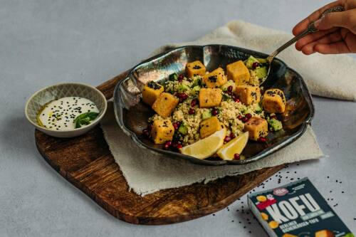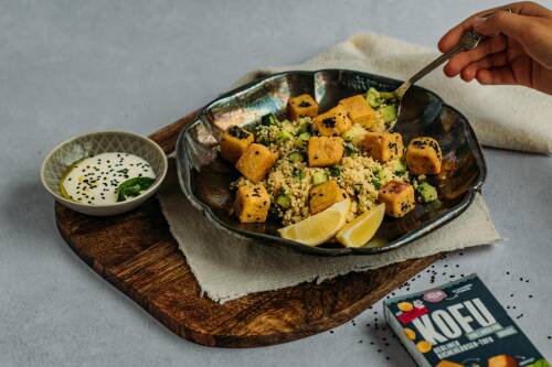 Falafel: Der Name ist Programm. Diese Variante schmeckt nach Falafel. Und eignet sich deshalb auch super für Salate, wie unseren Couscous-Salat (mehr dazu gleich) oder in Wraps. PS: Uns haben die angebratenen Kofu-Falafel-Würfel auch pur gut geschmeckt. So gut, dass wir aufpassen mussten, dass am Ende noch genug fürs Fotoshooting übrig blieb. Zum Glück haben wir wie immer großzügig gekocht. Diese Würfel sind definitiv eine gesunde Snack-Alternative zu Chips & Co.