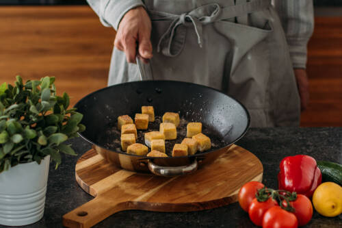 Und das in wenigen Minuten. Denn in der Pfanne ist Kofu nach maximal 5 Minuten fertig.