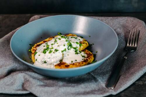 Dein geernteter Schnittlauch schmeckt hervorragen in einem Dip zu Kartoffelrösti. Foto: SevenCooks