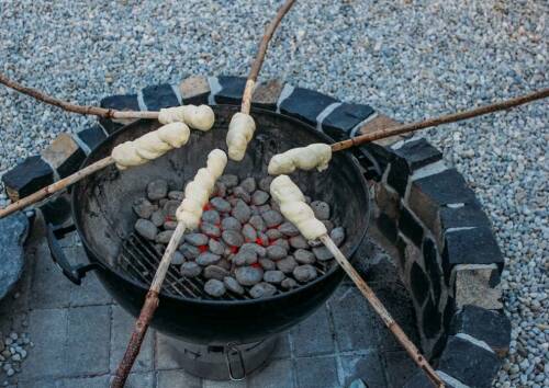 Den Teig kannst du trotzdem um kleine Äste wickeln und diesen auf dem Holzkohlegrill oder im Backofen backen.