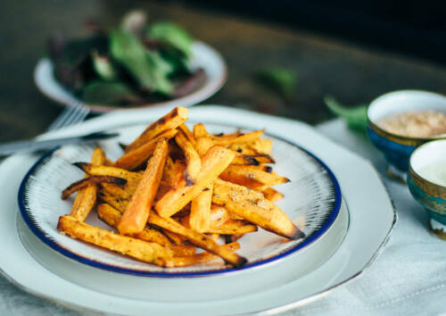Wenn Süßkartoffeln auf „1001 Nacht“ treffen, kommen dabei raffinierte Kreationen wie dieser Orientalische Flammkuchen mit Hummus heraus. Du liebst nährstoffreiches Fast-Food in veganer Rezeptur? Probier doch mal unsere knusprigen Süßkartoffel-Pommes mit Zweierlei-Dip aus dem Ofen – anstatt Billig-Burger mit Pommes aus Plastikfolie und Fritteuse – aus.