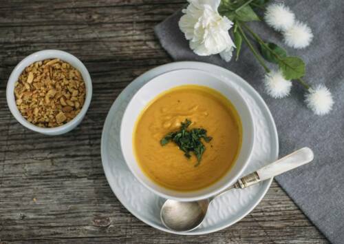 Als nährstoffreichen Starter empfehle ich dir, Süßkartoffeln als Suppe oder als Salat zu servieren. Probier doch mal unsere cremige, asiatisch inspirierte Süßkartoffel-Erdnuss-Suppe mit Ingwer, Chili und Limette. Oder diesen Süßkartoffel-Linsen-Salat, den kannst du auch exzellent in deiner Mittagspause im Office genießen.