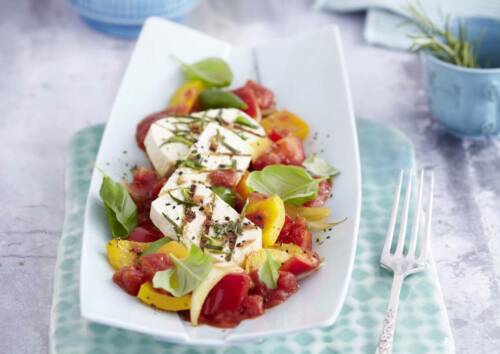 So schmeckt der Sommer: mediterran marinierter Tofu mit leckerem Paprika-Gemüse. Klappt nicht nur auf dem Grill, sondern auch in der Pfanne.
