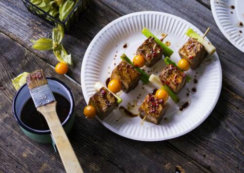 Asiatisch gewürzt mit Ingwer, Sojasauce und Chili sind die Tofu-Spieße mit Physalis ein echter Gaumenschmaus.