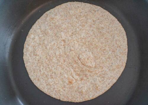 Tortillas ohne Öl in die Pfanne geben. Sobald sie kleine Bläschen werfen, umdrehen und noch einmal von der anderen Seite goldbraun braten.