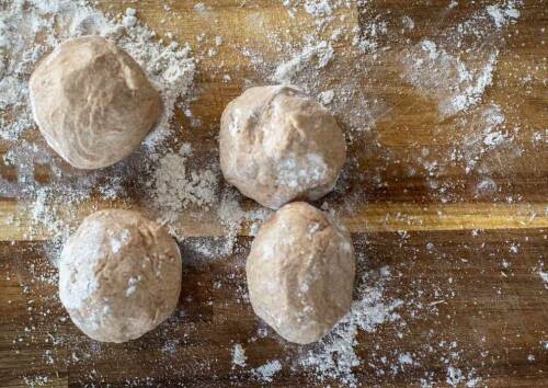 Arbeitsplatte mit Mehl bestäuben und die einzelnen Teigstücke mit einem Nudelholz ausrollen.