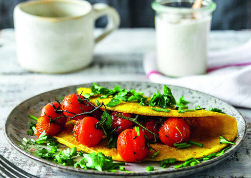 Auch wenn du dich vegan ernährst, musst du auf ein luftig-lockeres Omelette nicht verzichten. Die Zutat, die das möglich macht ist: Seidentofu. Dieser wird zusammen mit Kichererbsenmehl, Hefeflocken und Tapiokastärke abgeschmeckt und fein gemixt. Anschließend brätst du das Omelette mit etwas Olivenöl in der Pfanne aus. Die gerösteten Tomaten aus dem Ofen sorgen zusätzlich für eine fruchtige Note.