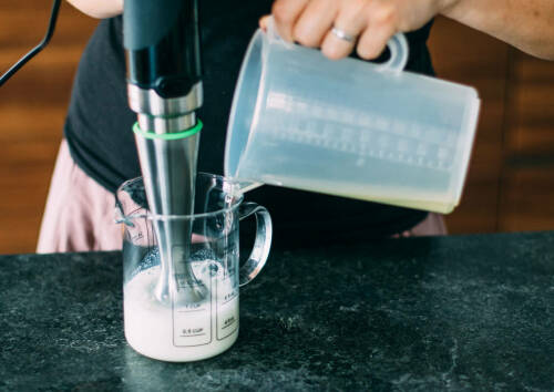 Die Sojamilch mit dem Zitronensaft in einen hohen Rührbecher geben und mit dem Stabmixer kurz verquirlen.