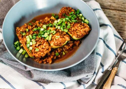 Grünkern ist in und spendet uns viele Vitamine und Mineralien. In diesem Gericht wird er mit fruchtiger Tomatensoße und knackigen Zucchini kombiniert, getoppt mit Frühlingszwiebeln und italienischen Kräutern – ein wahrer Genuss.
