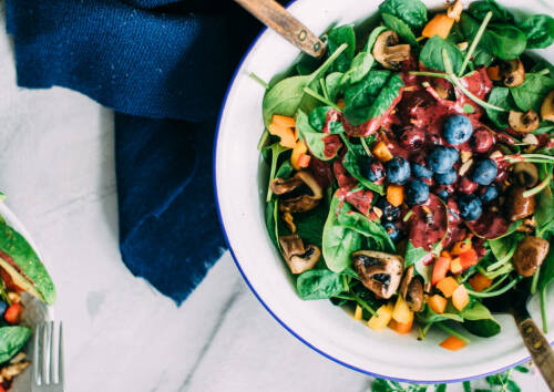 Dieser Salat kommt ganz fruchtig daher. Heidelbeeren und Zitronen verleihen dem Gericht seine Frische, während Walnüsse, Champignons und Olivenöl für deftige Aromen sorgen. Für ein besonders schmackhaftes Dressing fügst du einfach etwas Zimt und weißen Balsamicoessig hinzu. Fertig ist der sommerliche Salat.