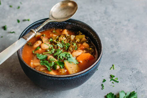 Minestrone ist etwas Tolles. Diese hier wird mit Bohnen zubereitet. Im Winter wärmt sie schön von innen, macht glücklich und vorbereiten kannst du sie auch noch. Bereite am besten also gleich etwas mehr zu und genieße die Gemüsesuppe am nächsten Tag noch einmal aufgewärt. Dazu passt ein Vollkornbrötchen super.