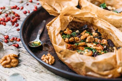 Ofengemüse kann jeder – die Winter Papilotte mit Walnüssen kennen aber nicht viele. Mit Rote Bete, Karotten, Kohlrabi und Grünkohl bleibt es bei altbewährten Zutaten, doch die Zubereitung im Backpapier-Päckchen macht auf dem Teller gleich viel mehr her. Geschmacklich bietet die Zubereitung auch einen Vorteil: Das Gemüse wird im eigenen Saft gegart, erhält dadurch eine feine Note und trocknet garantiert nicht aus.