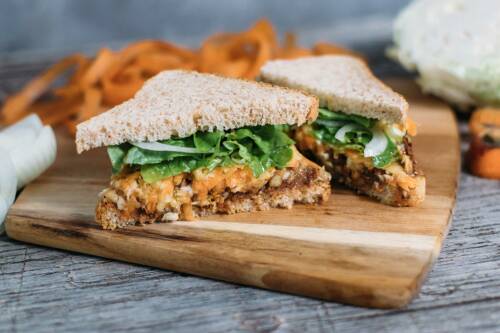 Eine der einfachsten Methoden, sich an den trendigen Fleischersatz zu wagen: Einfach mal aufs Sandwich packen. Zusammen mit Salat, Zwiebeln und Coleslaw wird daraus auch noch ein Genuss, der sich super für die Mittagspause im Büro oder zum Mitnehmen auf einen Ausflug eignet.