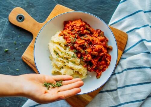 Donnerstag: Bohnen mit Räuchertofu und Kartoffelstampf