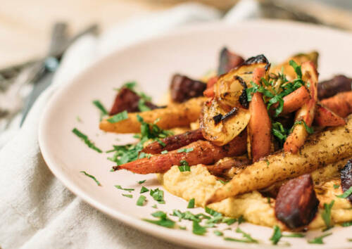 Dieses Gericht schmeckt am besten, wenn die Zutaten im Herbst und Winter regional und saisonal erhältlich sind. Denn dann bekommst du das Wurzelgemüse frisch aus aus der Region. Den Hummus kannst du auch mit heimischen Erbsen zubereiten. Petersilie, Kreuzkümmel und Knoblauch verleihen dem Rezept sein würziges Aroma. Probier's doch mal aus!