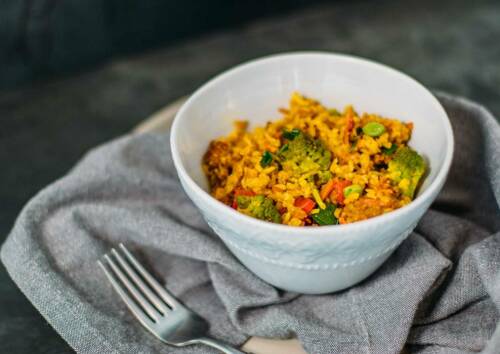 Gebratener Reis gehört zu meinen Feierabend all-time-favourites. Geht schnell und schmeckt trotzdem lecker. Dieser hier wird jedoch nicht, so wie sonst, mit Ei angebraten sondern mit jeder Menge frischem Gemüse. So sorgen Paprika, Karotten, Frühlingszwiebeln und Romanesco für jede Menge Vitamine und Mikronährstoffe nach einem anstrengenden Tag.