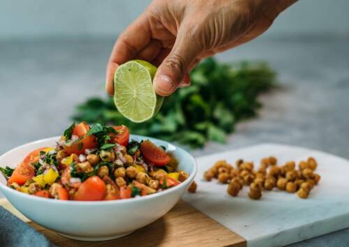 Eines meiner liebsten Feierabendgerichte: gerösteter Kichererbsensalat. Eiweißhaltige Kichererbsen und frisches Gemüse tanken deinen Energie- und Nährstoffhaushalt nach einem langen Arbeitstag wieder auf und die Zubereitung dauert nur 20 Minuten. Limette und Petersilie sorgen für einen sauer-würzigen Frischekick, der Abwechslung in das Dressing bringt. Klingt nach einem guten Deal, wenn du mich fragst.