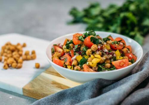Eines meiner liebsten Feierabendgerichte: gerösteter Kichererbsensalat. Eiweißhaltige Kichererbsen und frisches Gemüse tanken deinen Energie- und Nährstoffhaushalt nach einem langen Arbeitstag wieder auf und die Zubereitung dauert nur 20 Minuten. Limette und Petersilie sorgen für einen sauer-würzigen Frischekick, der Abwechslung in das Dressing bringt. Klingt nach einem guten Deal, wenn du mich fragst.