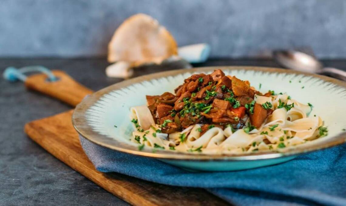 Zum Start in die Woche gibt es gleich was besonders Leckeres: Gulasch. Um nah an den Geschmack eines klassischen Gulaschs heranzukommen, wird die Jackfruit zuerst mariniert und anschließend scharf angebraten. Dazu gesellen sich noch Kräuterseitlinge und damit du ganz sicher satt wirst, ergänzen Bandnudeln das Gericht prima. Probier's doch mal aus!