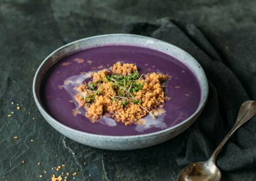 Unsere Rotkohlsuppe ist der Hingucker schlechthin! Doch sie sieht nicht nur gut aus, in ihr stecken auch viele wertvolle Zutaten. Die Zubereitung erfolgt auf der Basis von Rotkohl, Kartoffeln und Äpfeln. Dazu gesellen sich Thymian und Muskat und zum Schluss als leckeres Topping: Knoblauch-Semmelbrösel. Das solltest du dir nicht entgehen lassen.