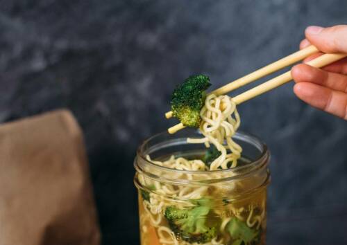 Jetzt in der kälteren Jahreszeit, darf auch ein Suppenrezept nicht fehlen. Dieses hier eignet sich besonders gut zum Mitnehmen. Du kannst dir also abends schon eine Portion genehmigen und am nächsten Tag im Büro eine weitere Portion Mie Nudeln mit leckerem Gemüse, Brühe und frischen Kräutern genießen. Guten Appetit!