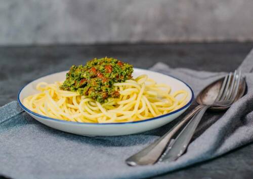 Zu Pasta passt Pesto wie die Faust aufs Auge. Doch traditionell enthält Pesto Parmesan und kommt somit für eine vegane Ernährung nicht in Frage. Doch wir haben ein Rezept für dich entwickelt, bei dem du den Parmesan ganz leicht durch Hefeflocken ersetzen kannst. Durch die Walnusskerne wird das Pesto zudem schön nussig und Zitrone sowie Spinat verleihen dem Ganzen eine frische Note. Lass es dir schmecken.