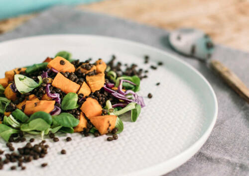 Zu Beginn der Woche gibt es einen Salat, der satt macht. Doch nicht nur das, denn Belugalinsen sind mit 7,5 mg/100 g ein toller Eisenlieferant. Wenn du keine zur Hand hast, kannst du auch "herkömmliche" rote oder gelbe Linsen verwenden. Die sind auch sehr gesund! Mich überzeugt die Kombination aus nussigen Linsen, leicht süßer Süßkartoffel und frischem Feldsalat. Darüber freut sich der Gaumen!