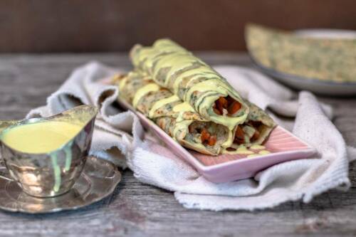 Mit ein paar simplen Tricks kannst du das Lachsaroma für dieses Gericht super imitieren. Hierfür werden Karotten und Algen verwendet. Zudem verleihen Piment, Sojasauce und Rauchsalz ein deftiges Aroma. Auch die vegane Hollandaise funktioniert prima zu den Pfannkuchen und kommt dank Margarine, Senf und Mehl der klassischen Version ganz nahe. Das solltest du unbedingt einmal ausprobieren!