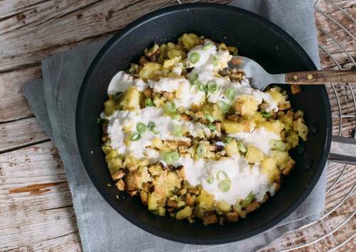 Manchmal dürfen es auch Reste sein. So wie unsere Smashed Potatoes aus der Pfanne. Übrige Kartoffeln, Sojaquark und Lauchzwiebeln – klingt einfach, schmeckt aber nach mehr und steht abends auch in unter 45 Minuten auf dem Tisch.