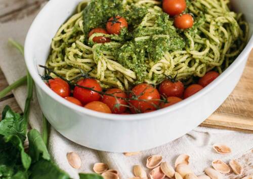 Pesto ist nicht nur was für arme Studenten. Auch als schnelles Familiengericht eignet sich Pasta mit selbstgemachten Pesto hervorragend. Mit Hilfe von Pistazien und Hefeflocken lässt sich dieses sogar ganz in vegan herstellen. Dazu schnell Spaghettkochen und mit Cherrytomaten garnieren – fertig ist der italienische Traum in nur 30 Minuten.