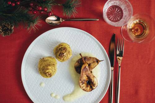 Veganer Hauptgang: Geschmorte Birnen auf weißem Schokopüree mit Kartoffelgratin–Türmchen