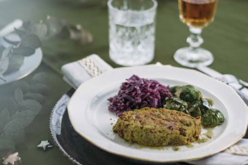 Veganer Hauptgang: Maronenbraten mit Blaukraut und Rosenkohlsauce