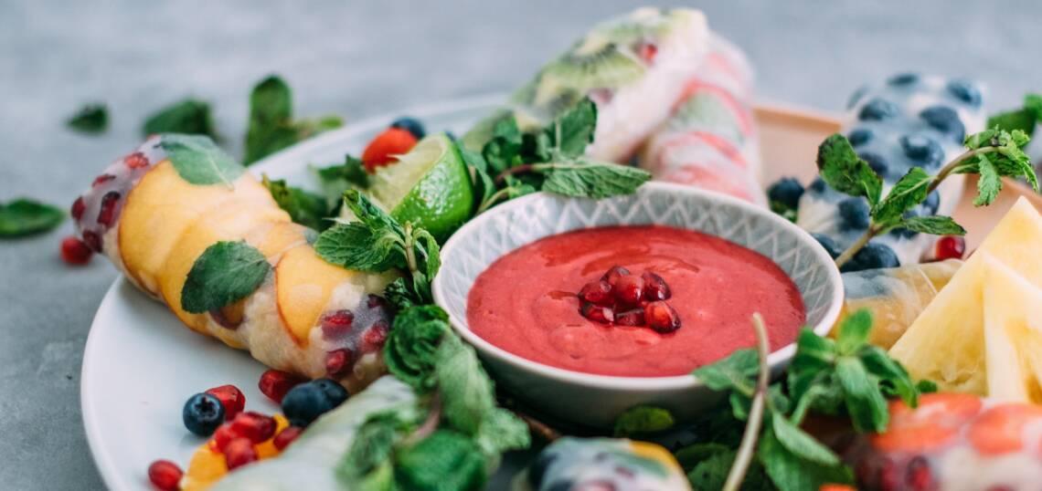 Summerrolls kommen aus Vietnam und werden klassisch mit Nudeln und Gemüse gefüllt. Doch auch in der süßen Variante machen sie einiges her. Fülle die leckeren Röllchen doch mal mit Früchten und Obst der Saison und serviere einen aromatischen Himbeer-Minz-Dip dazu.
