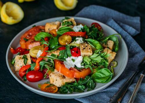 Tomaten-Brotsalat mit Büffelmozzarella & gegrillter Paprika