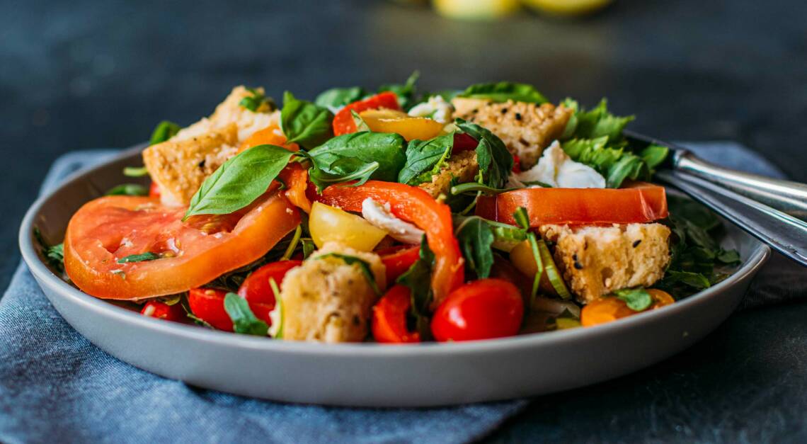 Bei diesem Salat kannst du nicht mehr ganz so frisches Brot gut verarbeiten. Ergänzt mit frischen Tomaten und gegrillter Paprika macht diese Rezept aber dennoch einiges her. Serviert mit Büffelmozzarella, sieht der Tomaten-Brotsalat nicht nur gut aus, sondern macht auch ganz sicher satt.