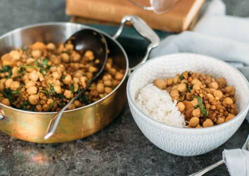 Proteine gefällig? Da wirst du hier fündig. Linsen und Kichererbsen sorgen für eine Eiweißbombe, der Reis sättigt und frisches Gemüse in der Erkältungszeit ist einfach immer gut. Zusammen mit Ingwer, Curry und Knoblauch kommt Indien auch in deine Küche. Für alle, die es extra "warm" haben wollen – einfach ein wenig Chili dazugeben und die feurige Note ist garantiert.