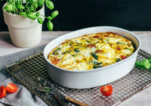 Die Frittata mit Eiern, Kirschtomaten und Spinat, ist tolles Gericht für einen geselligen Brunch mit Freunden oder der Familie. Dank Spinat und Tomaten gibt es hübsche Farbtupfer auf dem Teller. Mit nur 7 Zutaten zauberst du in Rekordzeit ein warmes Gericht, den Rest erledigt der Ofen.