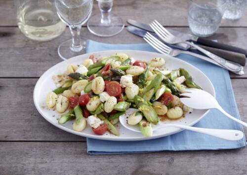 Abendessen: Gnocchi mit grünem Spargel mit Mozzarella, Zitrone und Olivenöl beenden unseren vegetarischen Ernährungsplan abwechslungsreich mit Genussfaktor. Als vitaminreiches Dessert gibt es einen Obstsalat aus 1 Apfel oder 1 Birne, 1 Orange & 1 Kiwi.