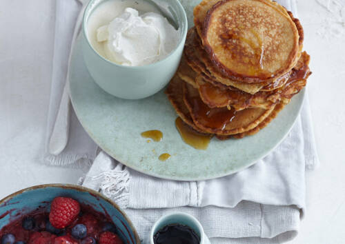Frühstück: Kefir-Pufferchen mit Beeren aus nährstoffreichem Dinkelvollkornmehl, Eiern, Kefir und etwas Zitronenschale werden mit einem cremigen Vanille-Ricotta und einem eisenreichen Beeren-Mix serviert. Eine köstliche Komposition mit einer Extraportion essentieller Aminosäuren.